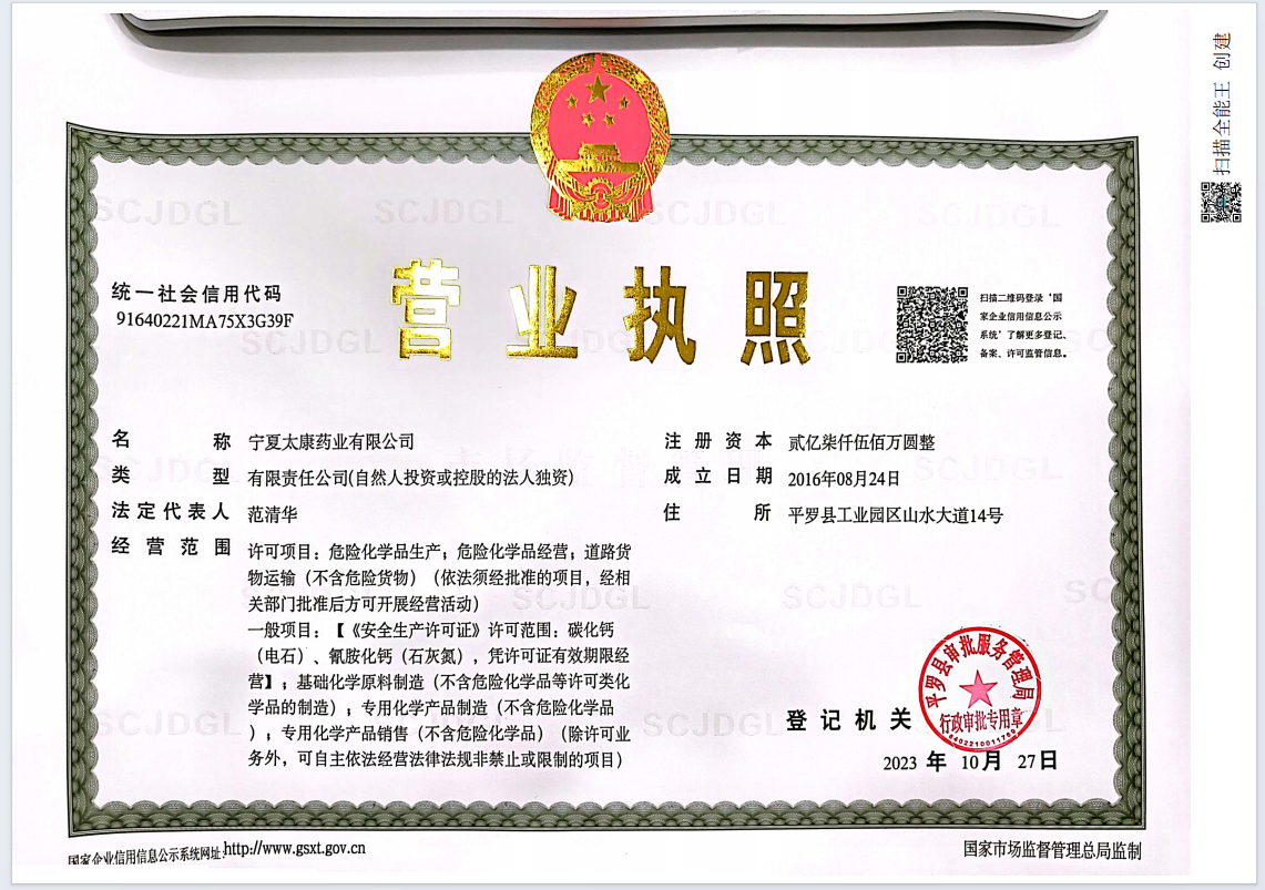 寧夏太康藥業有限公司是寧夏大地循環發展股份有限公司全資控股企業。工廠占地面積1600畝,擁有固定資產6.74億元人民幣,總裝機容量16萬KVA,是寧夏回族自治區 40家大型工業骨干企業之一。企業現有員工1100余人,其中主要管理人員134人,專業技術人員112人,高級工程師5人、工程師10人、經濟師3人、技師15人,公司擁有年生產能力:醫藥中間體產品-雙氰胺6WT、單氰胺5000T、一水肌酸3000T、氨基胍碳酸鹽3000T;化工基礎原料產品-石灰氮22.5WT電石12WT。